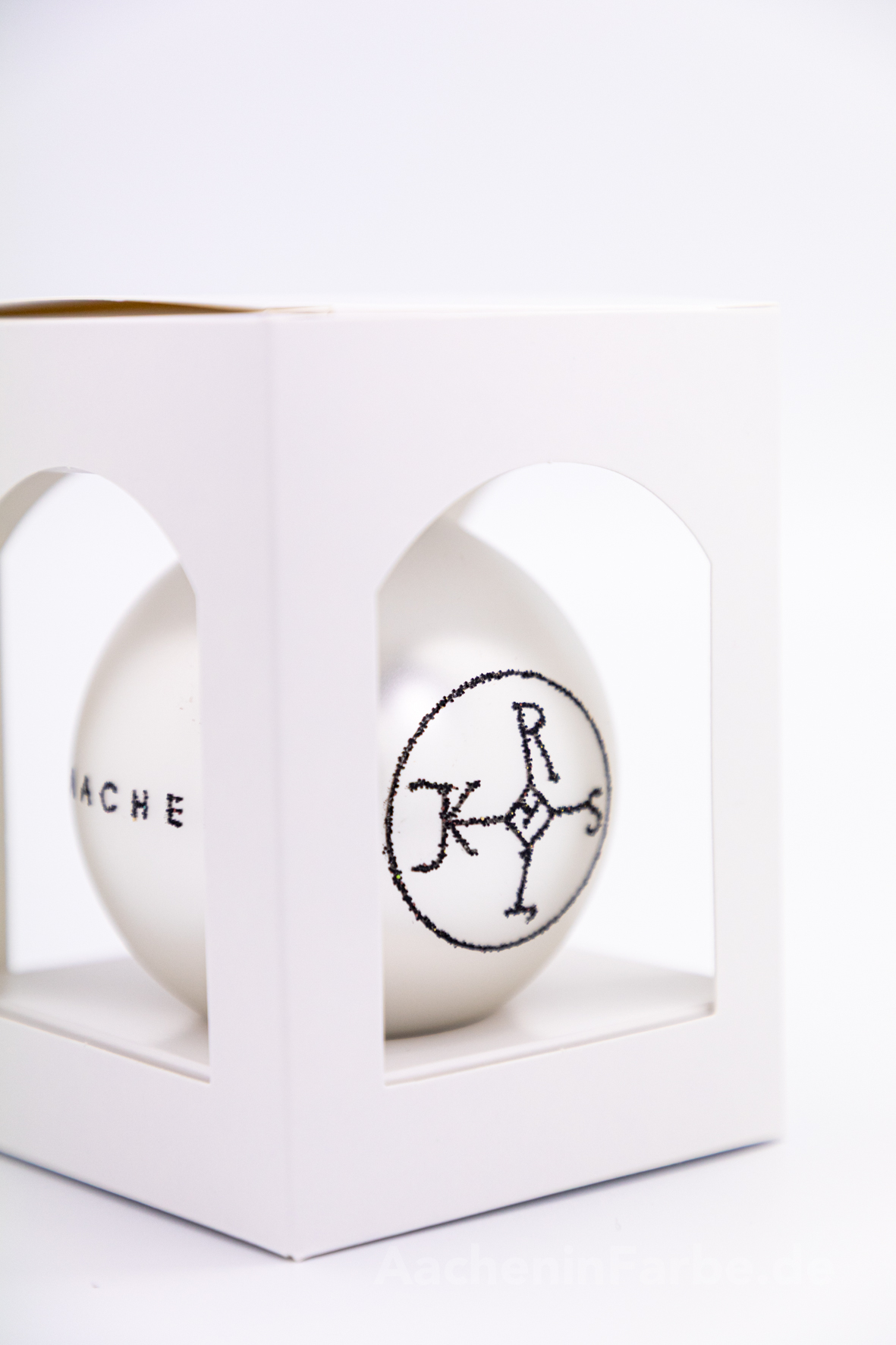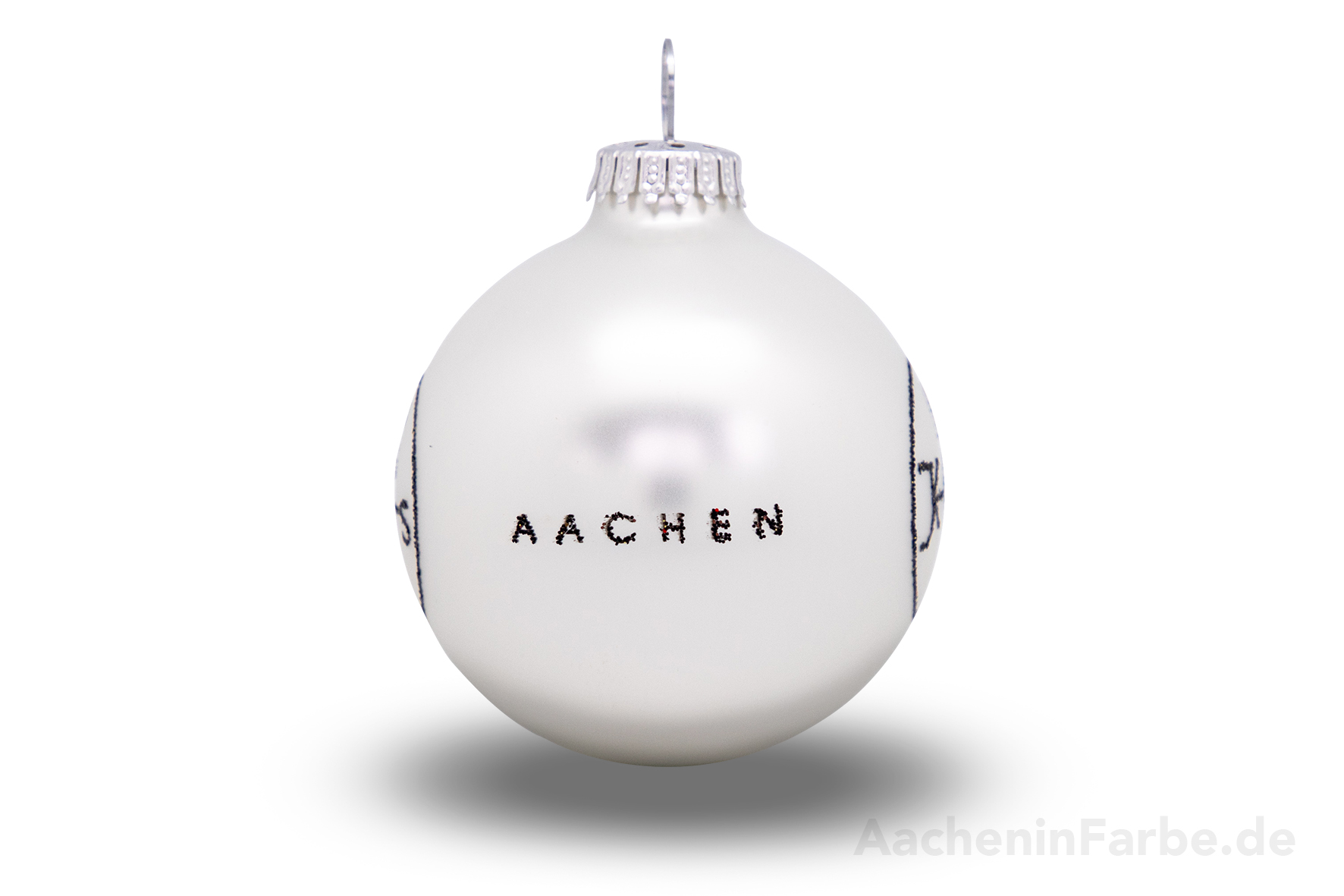 Die Christbaumkugel ist ringsum bedruckt mit glitzernden Linien.  Zu sehen sind auf Vorder- und Rückseite das Karlssiegel (gegenüberliegend), sowie der Schriftzug AACHEN (gegenüberliegend).